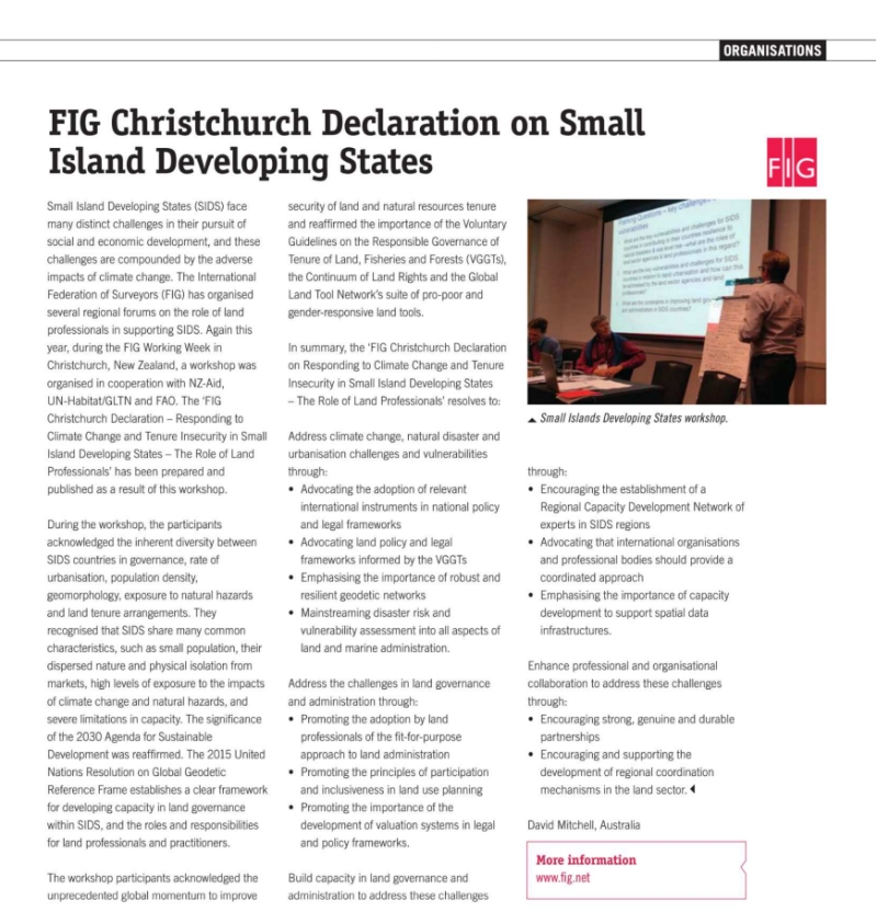 In summery, the "FIG Christchurch Declaration on Respondind to Climate Change and Tenure Insecurity in Small Island Develping States - The Role of Land Professionals' resolves: