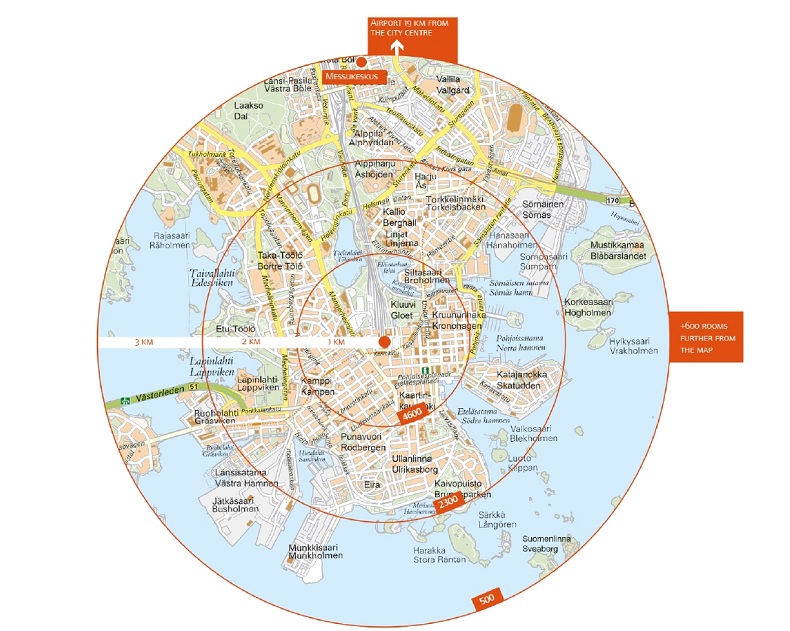 The Helsinki metropolitan area boasts about 80 hotels and almost 12,000 rooms ranging from first-class hotels to hostels for those on tighter budgets. Most of the hotels are within 1.5 kilometres in the city centre with easy access to Messukeskus Helsinki. In addition, there is a Holiday Inn Hotel connected to the venue and Sokos Hotel Pasila only a ten-minute walk away.