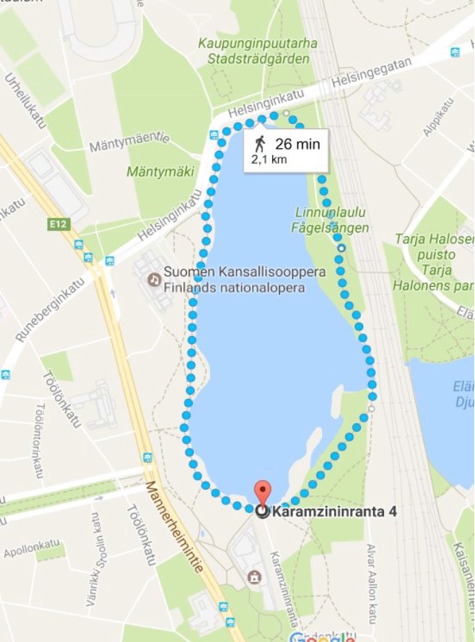 The course is set around Töölönlahti Bay, located centrally within the city. Starting point and finish is located at the corner of Finlandia Hall.