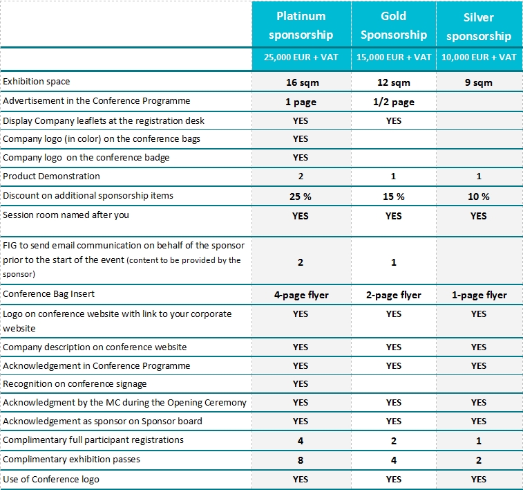 Exhibitors have an opportunity to add-on a sponsorship packages. Book a booth and add-on a sponsorship packages  to broadening your competitive edge by improving your company’s image, prestige and credibility by supporting the FIG Working Week.