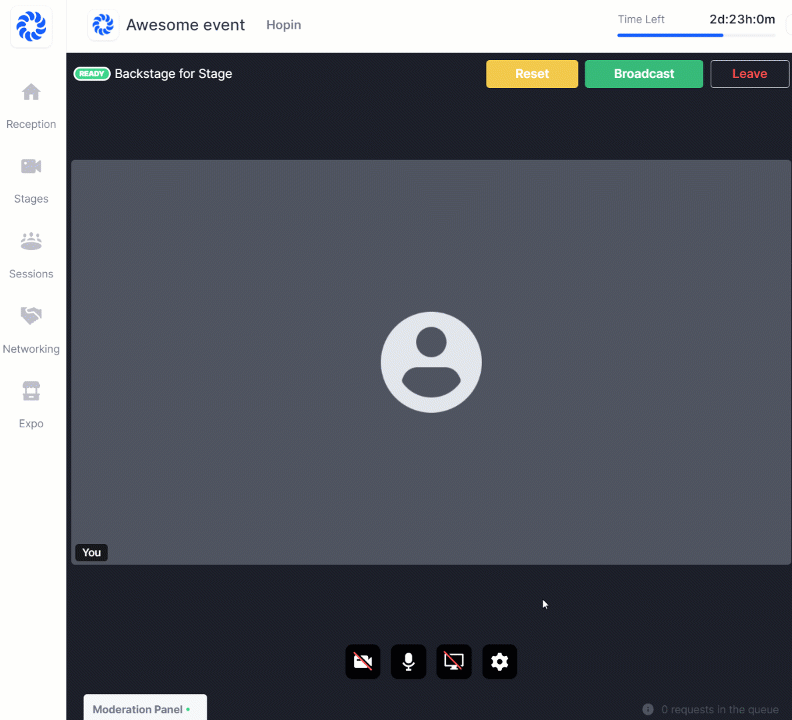 The moderators see a "Moderation Panel" at the bottom left of their screen. When you requests to go on-screen, your name and profile picture appear under the Moderation Panel.