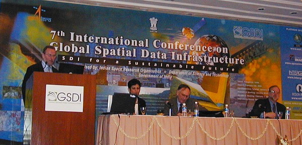 President Ian Masser, GSDI, Preetha Pulusani, Intergraph, Jack Dangermond, ESRI and Mark Reichardt, OGC at the opening session of GSDI-7.