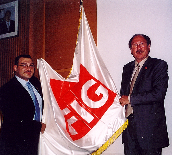 President Magel and Yaacoub Saade and the new FIG flag produced by the Order of Lebanese Surveyors.