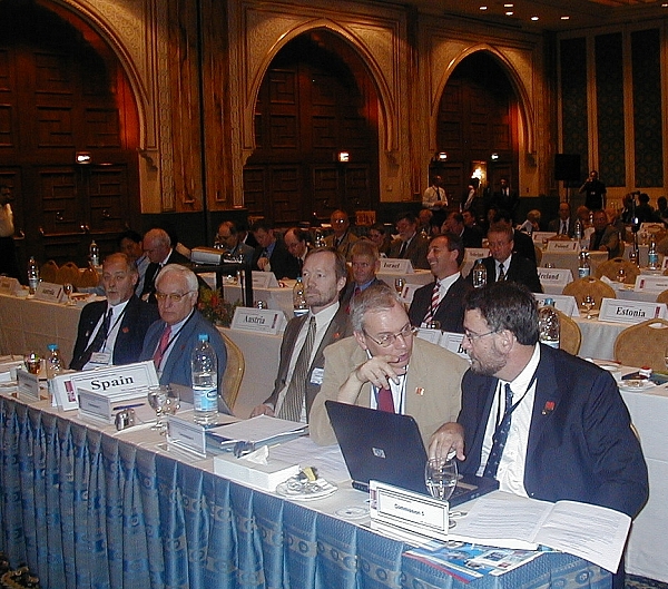 Matt Higgins (Comm. 5) and Adam Greenland (Comm. 4) discussing the commission issues at the General Assembly. At the background Gerhard Muggenhuber (Comm. 3), Pedro Cavero (Comm. 2) and Klaus Rürup (Comm. 1).
