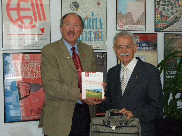 After his participation to the XXII UIA Congress in Istanbul FIG President Holger Magel made an official visit to Ankara and had a meeting with the Turkish FIG member association, the Chamber of Surveying and Cadastral Engineers (HKMO). As the Chamber is strongly interested in land consolidation Magel's gift to HKMO President Hüsein Ülkü was the proceedings of the FIG Commission 7 Annual Meeting and Workshop in Clermont Ferrand last year (see picture). President Ülku announced that the Chamber is going to strengthen its contributions to FIG commissions work by nominating new delegates. Against the background of the intended accession of Turkey to European Union Prof. Magel was asked to give two lectures about “European policy for rural development” and “New paradigms in Land Consolidation”. One of the attentive listeners was the Director General of the Turkish Land Registry and Cadastre M. Zeki Adli.