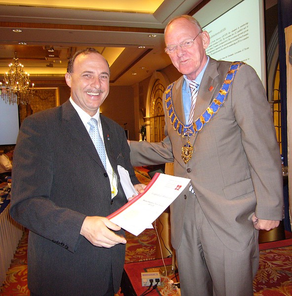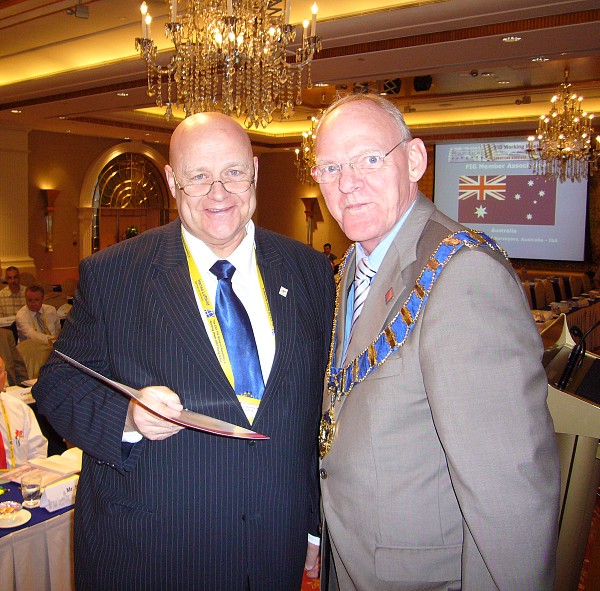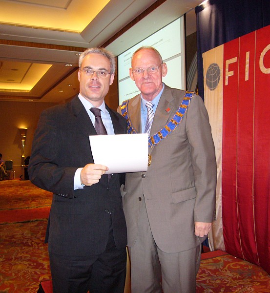 Prof. Bela Markus receives his FIG badge from President Enemark. |