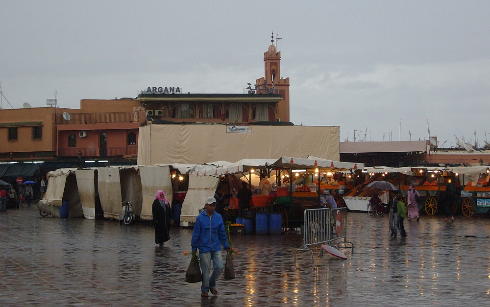 Djamaa El Fna square in Marrakech. On the background Argana restaurant that was ht by the bomb blast 28 April. Delegation from FIG Working Week visited the venue to respect the memory of the victims of the sad incident.