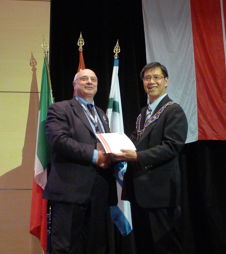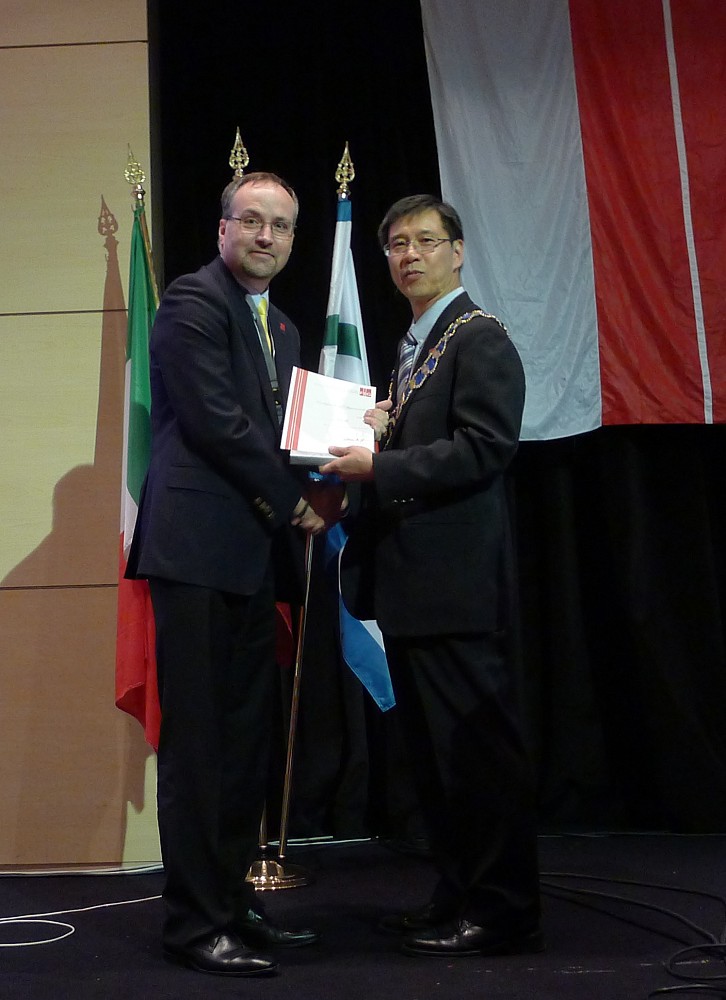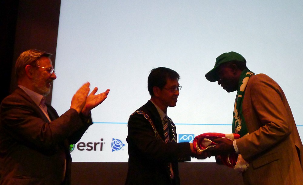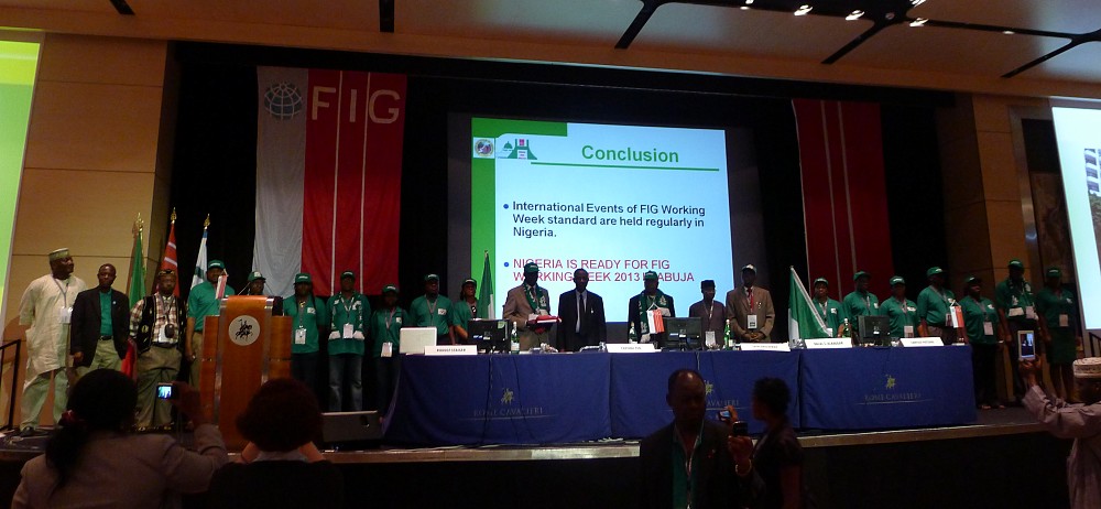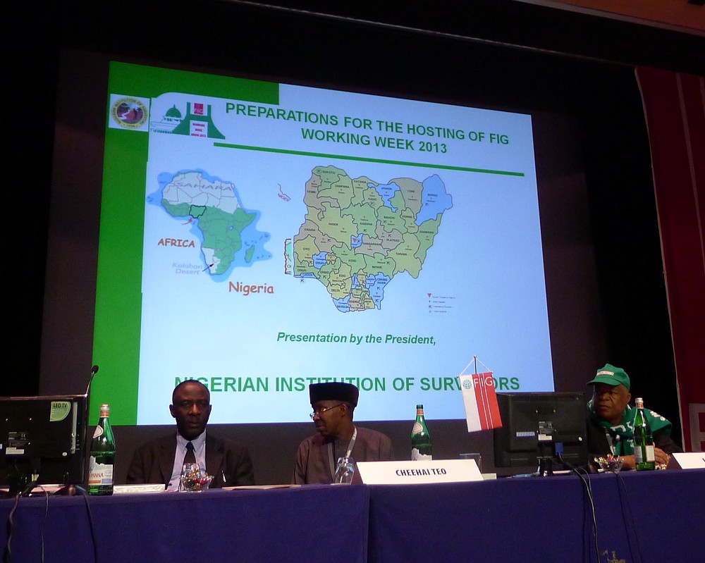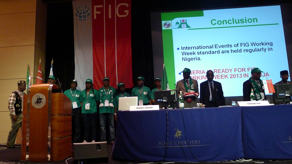 At the flag ceremony the FIG banner was given from CNGeGL, Italy to NIS, Nigeria that will host the Working Week in 2013 in Abuja.
