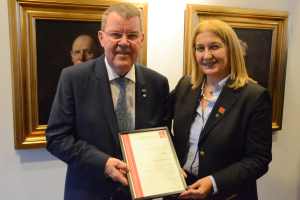 Chryssy Potsiou presents certificate to Henning Elmstroem