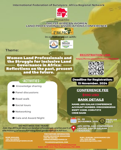 The organizers of the Conference, that is International Federation of Surveyors-Africa Regional Network (FIG-ARN), Network of Excellent on Land Governance in Africa-East African node (NELGA-EA) and Ardhi University of Tanzania cordially and warmly invite you to attend 1st African Women Land Professional Associations Conference (FAWLPAC) scheduled to take place at the APC Hotel and Conference Center, Dar es Salam, Tanzania from 24-28 November 2024.