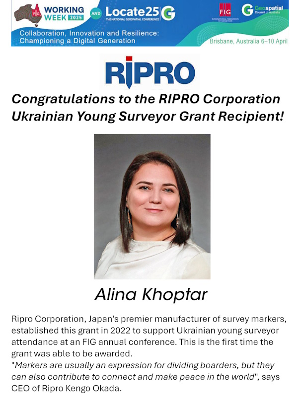 Alina Khoptar will be attending and participating in all activities of FIG Working Week 2025 from 6 - 10 April 2025 at the Brisbane Convention & Exhibition Centre (BCEC), Australia.