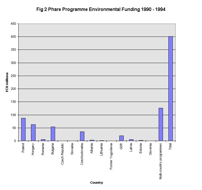 Direct environmental aid spending since 1989 under the Phare Programme, totals over ECU 400 million (Fig 2). The aim of the Phare Programme is to help the countries of central and eastern Europe rejoin the mainstream of European development through future membership of the European Union. In the first five years of its operation to 1994 Phare has made available ECU 4.2 billion across all sectors to 11 partner countries, making it the largest assistance programme of its kind.