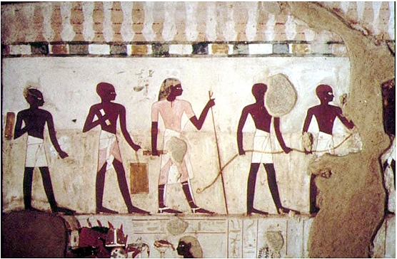 “The snake has seized half the grain, and the hippopotami have eaten the rest. Mice abound in the fields, the locusts descend and the herds devour; the sparrows steal – woe to the farmers! The remains on the threshing floor are for the thieves. The team is dead from threshing and plowing. The scribe moors at the riverbank, and goes to record the harvest. His guards have clubs and the Nubians accompanying him have palm branches. They say: ‘Give the grain!’ ‘There is none!’ They beat the peasant furiously, and bind him and throw him into the ditch. The scribe controls everyone’s work.”