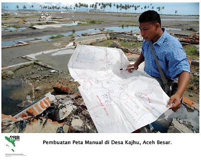 The integrated works of all stakeholders has been performed through local, national and international links to increase sharing and documentation of experience to facilitate implementation and face the complexity of decision-support challenges. One of the important consequences of the second step has therefore been the inclusion of people as the key stakeholder, alongside technical and institutional elements. In photo 2 the process of mapping in the village of Kajhu, Aceh Besar has shown the role of people as the key stakeholder.