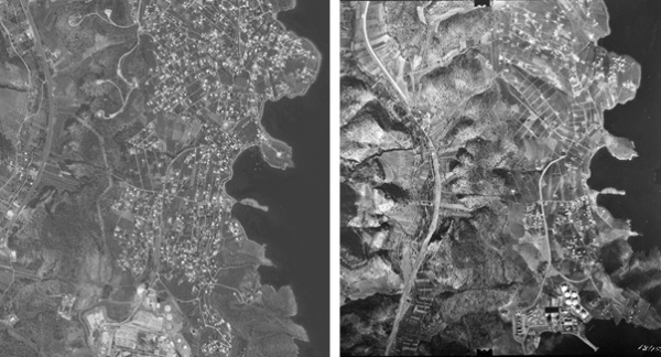 Figure 4. Satellite image (WorldView 1) of the case study area of 2009 (left) and aerial photo of 1980 (right)