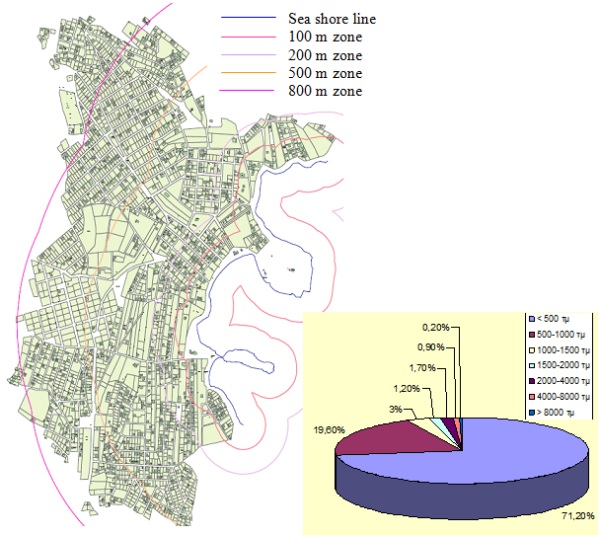 Figure 5. Left: Cadastral map with buffer zones according to the distance from the sea.