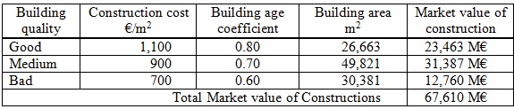 The total cost of construction is 67,610 million € (Table 1). The total market value of land of the developed parcels in the study area is: 100€/m2x (123.5 ha x 0.38) = 40 million €