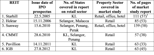 This paper examines whether these reports meet the property market information requirements of REIT investors by examining retail market study reports found in the REIT IPO prospectuses of Bursa Malaysia for the 2005 to 2013 period.