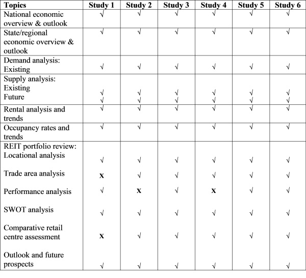 A retail market study that concludes that there is good prospect in investing in the REITs should contain analyses and evaluations that are supported by facts and figures. Table 3 examine and evaluate whether there are any weaknesses in the retail market studies.