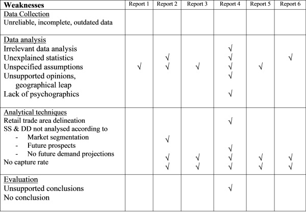 Content analysis using the criteria is applied to examine whether there are weaknesses in the retail market studies. The analysis found that the general headings and contents of these retail market studies are generally the same. However a detailed content analysis reveals that there are weaknesses in the areas of data analysis and analytical techniques of these retail market studies.