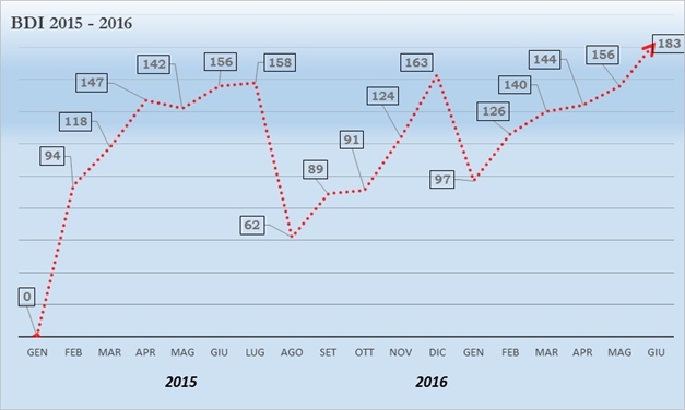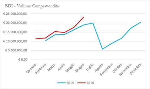 Figura  SEQ Figura \* ARABIC 1: Andamento temporale di inserimento dei comparabili tratti da recenti compravendita archiviati nel BDI fra febbraio 2015 e giugno 2016.