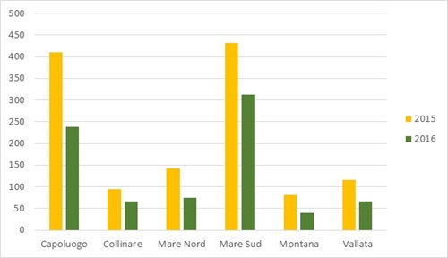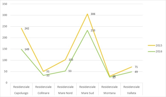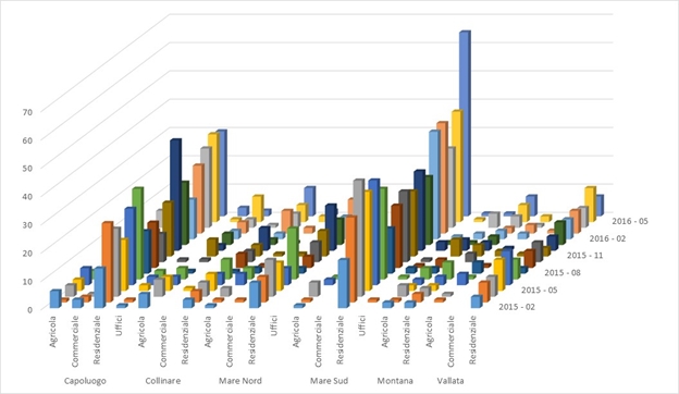 The data shows that despite the fact that the Capoluogo hosts the provincial capital, Ascoli Piceno, the Macroarea of Mare Sud seems to be more active with real estate transactions, surpassing the Capoluogo by 37.8% in 17 months of the Project. This trend seems to be consistent both in 2015 and 2016. The Municipality of San Benedetto del Tronto seems to have a slightly more active real estate market despite having a smaller area. Further analysis seems to indicate that the reason for this trend is because of the geographical location of San Benedetto del Tronto (seaside) and the abundant number of medium to high rise condominium.