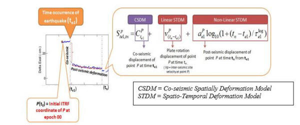Meanwhile, in the current practice of high precision ITRF, the  is computed by assuming that the crustal deformation refers to plate rotation and post-seismic trend after the occurrence of earthquake as in Equation 2 which depicts a non-linear trend.