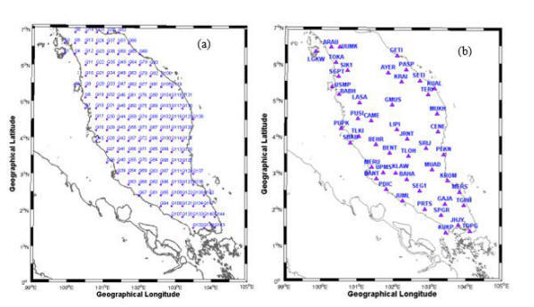 Figure 2: (a) Quasi-Network grid (Q1-Q144) with spatial resolution 0.3°×0.3° ; and (b) distribution of MyRTKnet in Peninsular Malaysia.