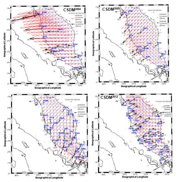 Finally, vectors of CSDM2012 represents spatial distribution of during the 2012 Indian Ocean earthquake (8.6Mw). The model was determined from the knowledge of estimated from thirty-four (34) MyRTKnet sites. One can inspect that the vector of CSDM2012 headed to northeastward (azimuth from ~N145o to ~N246o) and depicted different co-seismic pattern as compare to the other CSDMs. This can be explained due to the internal deformation of the diffused plate boundary between India and Australia plates that caused the Peninsular Malaysia to be co-seismically displaced away from the earthquake’s epicenter.