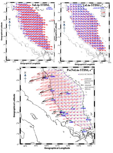 Nine (9) years of high precision daily GPS-derived coordinate time series (CTS) in north as east components has been generated by using GPS  data as recoreded by MyRTKnet stations since December 2004. The GPS-derived CTS at these CORS were utilised to estimate information of , ae1, and . Meanhwile, were extrapolated from the knowledge of Sunda plate motion model by Mustafar et al., 2016. These estimated values were then utilised to generate CSDM and STDM at Quasi Network points using least-square collocation as in Equation (3-5). Figure 3 presents CSDM vectors at Peninsular Malaysia during the occurance of four (4) great earthquakes. The vector of CSDM2004 was predicted from the knowledge of  (north and east) during 2004 Sumatra Andaman earthquake (9.2Mw) which was detected by fourteen (14) MyRTKnet stations. These vectors were headed to earthquake’s epicenter (northern part of Sunda trench) at azimuth N256o (southwestward) in northern part and decreased to N264o (northwestward) in southern part of the region. Large predicted co-seismic displacements (north and east) was found with the highest magnitude of 185 mm at point Q1 (northwestern part of the region) and decreased to 24 mm at Q144 (southeastern part of the region). Similar to CSDM2004, the vector of CSDM2005 was predicted from the knowledge of of 2005 Nias Simeulue earthquake (8.5Mw) by using fourteen (14) detected MyRTKnet stations. It can be inspected that, the pattern of CSDM2005 vectors varies over Quasi Network points. The predicted vectors were found to be headed to the earthquake’s epicenter with azimuth varying from ~N216o to ~N238o. Large predicted co-seismic displacements were found at Quasi Network points near to site PUPK at predicted displacement of 67 mm. Meanhwhile, CSDM2007 vectors was predicted from the knowledge of co-seismic deformation of 2007 Bengkulu earthquake (7.9Mw) as observed by twenty-eight (28) MyRTKnet sites. As seen from the figure, the magnitude and direction of CSDM2007 significantly vary over latitudinal direction. Heterogeneous co-seismic displacement can be seen from east to southeast direction and headed to the earthquake’s epicenter (in Mentawai trench, Indonesia) with azimuth that varies from ~N145o to ~N246o. Large predicted were found with highest magnitude of 31 mm at Quasi Network points near to site KUKP (southern part).