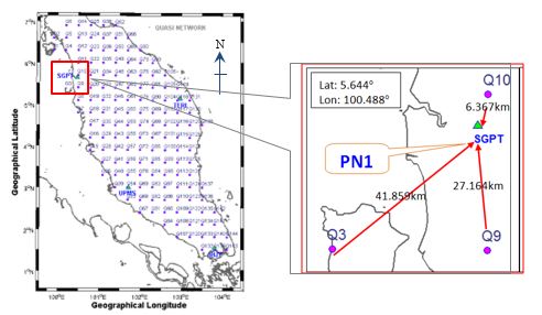For assessment of STDM and CSDM, experimental works has been conducted to test the efficiency of the model to predict crustal deformation trend by following three (3) assumptions; Assumption 1, Assumption 2 and Assumption 3 and its explanation as tabulated in Table 1. Crustal deformation trend prediction for each three assumptions was performed at four (4) different locations of testing point. These points were closed to MyRTKnet stations (i.e., SGPT, UPMS, TERI, and JHJY) whereby the 9 years of daily GPS-derived CTS in north as east components from these four MyRTKnet sites were independent from STDM and CSDM generations. Figure 5 shows locations of PN1 situated in the northern part of Peninsular Malaysia (assessed with MyRTKnet station SGPT).  The assessment result is potrayed in Figure 6.
