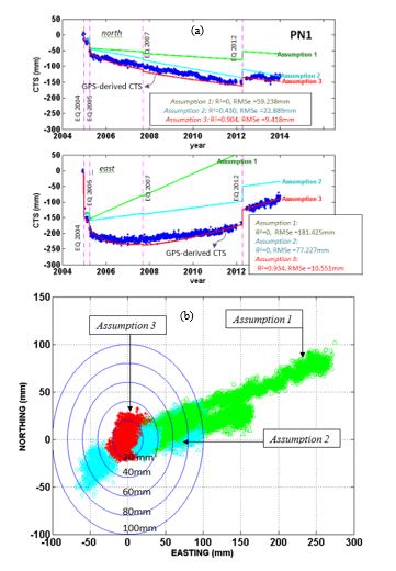 As seen in Figure 6, the simulated CTS at PN1 based on Assumption 1 led to large difference of RMSe about 59.238 mm and 181.425 mm in north and east components respectively. The simulated CTS from Assumption 2 were different from actual GPS-derived CTS in north component with RMSe at 22.889 mm. However large RMSe was depicted in easting components up to 77.227 mm. Simulated CTS from Assumption 3 shows good fit with the GPS-derived CTS in north and east components with averaged RMSe and averaged R2 at 9.984 mm and 0.918 mm respectively.