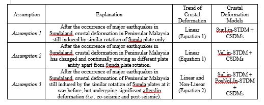 Table 1: Three (3) assumptions of crustal deformation trends in Peninsular Malaysia to simulate the test based on the assumptions