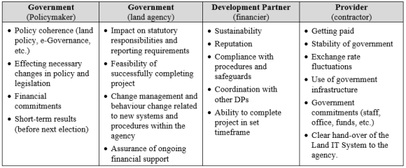 Whilst only briefly mentioned above, risk is a key component of private sector appetite that needs to be understood when considering investments in land administration systems. Risks may include those typically associated with investments in information technology – for example, issues arising from unclear and changing scope, schedule, resources and technology. They may also be associated with the typical timeline of development partner projects (if involved) or related to general institutional risks, including legislative gaps, incomplete/poorly maintained existing systems, limited technical and other resourcing capacity, etc. A State of Practice publication developed for the Millennium Challenge Corporation (LEI, 2020) briefly summarises the major risks to stakeholders of investing in land administration system projects.  REF _Ref67317009 \h Table 1 recognises the different perspectives on the risks of investing in land administration systems (noting the emphasis in the document on technology projects). These risks should be considered upfront during identification, feasibility and design stages of a project, though many associated with the Provider may ultimately be addressed through project implementation. For example, national governments will wish to consider the extent of coherence with existing policies and will likely have decision-making impacted by election timeframes. Similarly, development partners will also be restricted by typical project timeframes and will further wish to ensure initiatives that demonstrate sustainability and compliance with safeguards. Providers, on the other hand, will want to see demonstrated certainty around payment measures, government commitments and handover measures (as appropriate). The list of risks in Table 1 is not intended to be comprehensive, instead it provides an overview of the different risks, and perspectives on risk, that need to be taken into consideration within a PPP, and, furthermore, within a PPP that seeks additional development partner support.