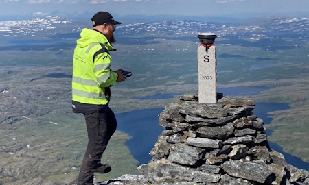 Figure 6: A small stone cairn as a boundary marker that do not define the boundary has been erected on the highest point along the boundary (1752 metres above mean sea level), here surveyed with network RTK by Swedish field engineer Karl Tirén.
