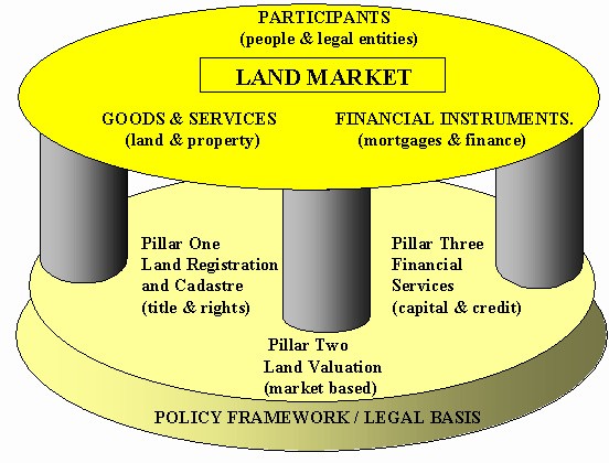 The Three Pillar Land Market Model is shown in Figure 1. The three regulatory pillars are constructed upon the legal framework of the country and are strongly shaped by the land policies adopted by government. Regulatory pillar one (land registration) provides the connection between land and property on the one hand, and people and legal entities on the other. Regulatory pillar two (valuation) provides the connection between land and property and finance mechanisms, while the third regulatory pillar (financial services) establishes the connection between finance mechanisms and people and other legal entities.
