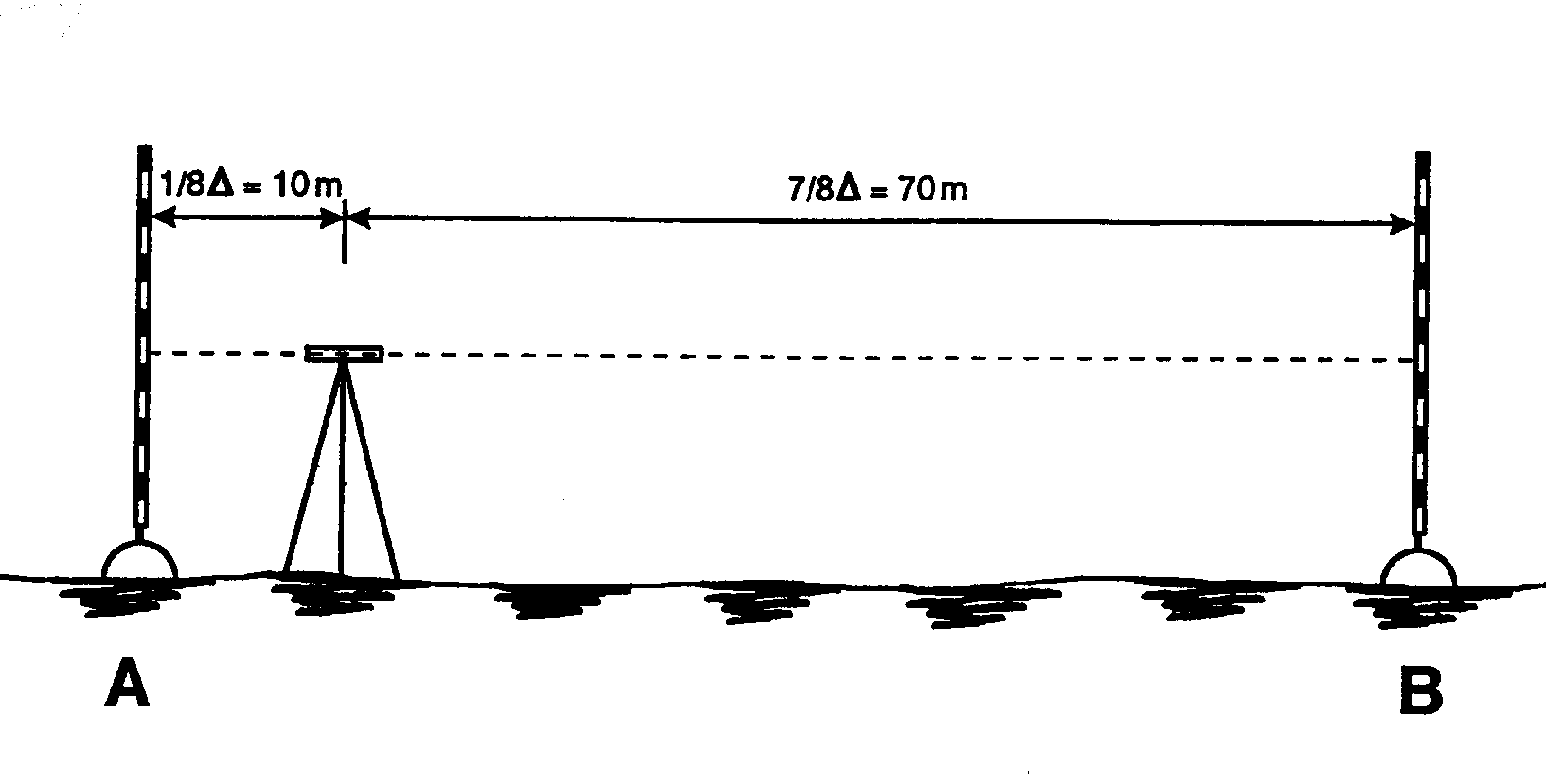 In a relatively plane area two points A & B have to be monumented at a distance corresponding to the maximum and minimum sight length ranges that will be used inside the specific project. As an example if inside a construction project the needed sight lengths are between 10 and 70m, the distance for AB will be about 80m. The points A and B have to be stable during the test period.