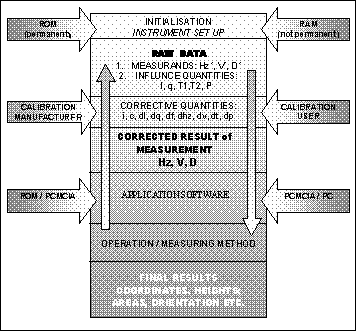 The old notions concerning the external structure of e.g. a theodolite, from which you could derive well defined procedures for handling, checking, adjusting or calibrating, are partly totally out-dated. Modern surveying instruments are better structured on the base of sensor components or functionality (Fig. 2) This points out much better the opto-electronic concept and clarifies additionally interconnection of sensor units, firmware, application software, data acquisition, data transfer and user interface. Operation of these hybrid systems has become as complex nowadays making it nearly impossible to survey all functions. The first initialising procedure of an electronic tacheometer can require more than 100 (!) operating steps (keystrokes) and settings. Multitude of instructions and data entry not only has the advantage of extended applications but also is implying as well for the manufactures as for the user to produce (instrumental) errors (Hennes, 1998). The complex sequence from original sensor signals to final results often makes it impossible to locate the reason for a wrong measuring result. Furthermore it is impossible to decide if this was a user´s wrong operation or a failed measurement. The interaction of configuring an instrument, controlling, correcting and data processing demonstrates Fig. 3. That is why it becomes more and more difficult to design robust checking methods. Particularly it is advised to check preferable sensor groups or if possible the complete measuring device using a most simple but effective and representative procedure.