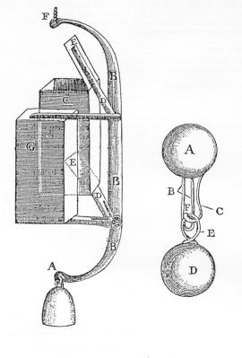 Hooke visited many times various coffee houses in London where he met, smoked, ate, drank coffee, gossiped and debated freely with a wide cross-section of society. In Garraway's for example, the clientele was mainly engaged in maritime trade as merchants, underwriters or ships' captains. Hooke frequently gave to the seafarers lists of observations and experiments he wished them to make in far-off lands and objects to bring back for scientific study. In September 1663 he presented to the Royal Society his first mechanical devices for collecting samples of sea-water from any depth and for depth-sounding without using a line (Gunther, 1930). The samples were collected by lowering a container C (Figure 1, left) attached to a bracket B by a line attached at F. The vanes E (with arms D hinged at the bracket B) opened as shown when the device was lowered through the water. When the pre-determined depth had been reached according to the knots on the line, the line was jerked upwards, closing the vanes E on their arms D so that the container C became sealed as at G. The container with the sampled water inside could then be raised to the surface, the vanes E remaining closed. The depth-sounding device (Figure 1, right) was made of a weight D having a fixed ring E, connected to a buoyant ball A having a long staple B, by a spring clip C. The contraption is released from the water surface and falls to the sea bottom whereupon the inertia of the ball A depresses the spring C which frees the ball A to return to the surface. The "time of flight" is recorded and can be converted to depth if the speed of the falling weight D is equal to the speed of the rising ball A and is known by calibration. It is likely that Hooke had the simple devices made and then tested by mariners, because from time to time he reported on various significant and increasingly ingenious improvements, the last in December 1691 (Hooke, ed. Derham, 1726).