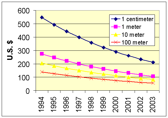 Figure (1) shows the projected development of GPS module cost. For the accuracy range considered here, it has reached the unit price of about $100 and predictions are that it will drop to about $50 by 2005 when, most likely, it will level off. Module cost are not equivalent to system cost, but the recent development of navigation receivers at a price of a few hundred dollars shows clearly that module cost are an important factor. Even more important is the fact that with unit cost that low, GPS is becoming a commodity, comparable to a Sony Walkman, pocket calculators, or a digital wristwatch. Thus, personal GPS devices will soon start to drive the module market and provide navigation receivers of high versatility at even lower cost.