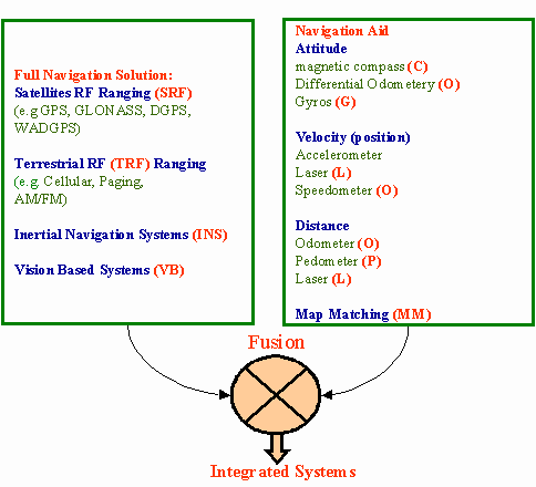 The GPS is capable of providing positioning and navigation parameters in all situations where uninterrupted signal reception is possible and the general satellite geometry is within acceptable limits. It is also evident that other navigation technologies are currently not capable of providing similar accuracies at a comparable price, i.e. there is not real competition to GPS in a scenario of uninterrupted signal reception. This leaves two scenarios to be considered. The first one is that of intermittent signal reception, as for instance in heavily forested areas or in urban centres. The other one is that of no signal reception at all, as for instance in buildings, underground or underwater. In the first case, GPS has to be integrated with other navaid sensors to bridge periods of no signal reception. In the second case, GPS has to be replaced by another system that can provide continuous navigation in those environments where GPS does not work. In terms of systems, both INS and vision-based systems (mainly for robotics applications) are the most commonly used systems. In terms of navaids, odometers, gyros and digital maps will be considered for land vehicle navigation, and pedometers, magnetic compasses, digital maps, and cellular phones for backpack systems.