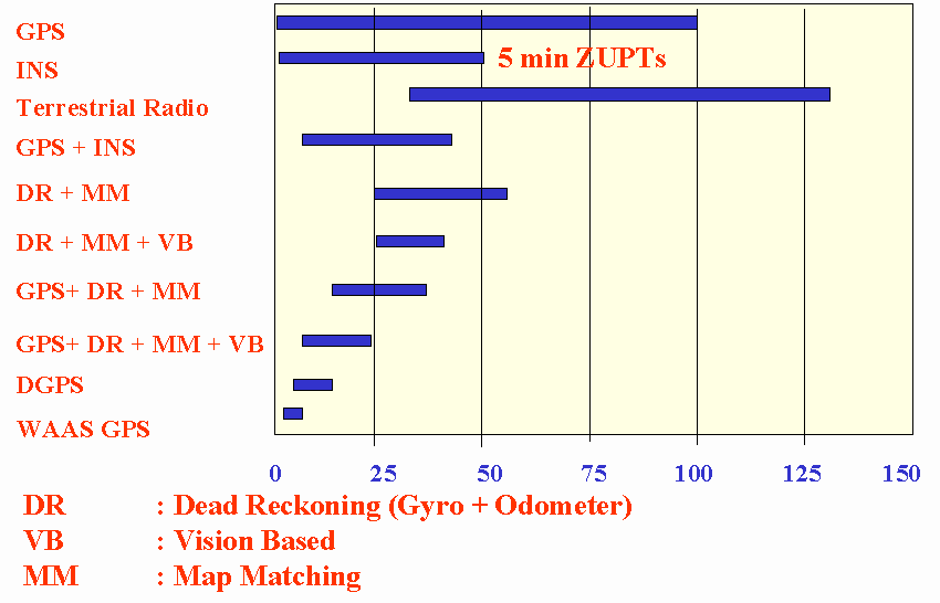 The Tables indicate that a wide variety of integration strategies can be implemented. Each has its own characteristics and the choice of a specific system will be based on system requirements and applications. Although it is possible to integrate any set of technologies, the integration of GPS and INS represents the core of for any integrated systems where reliability and versatility are the major issues. The low cost of GPS receivers, the coverage and reliability of GPS, and the expected decrease in cost of MEMS-based inertial sensors make GPS and INS the logical technologies for realizing the benefits offered by integrated positioning systems. Many companies are currently working on the integration of MEMS based IMU with GPS, with projections of size, weight and power at 2 x 2 x 0.5 cm, 5 g, and less than 1 W for implementation at the ASIC level. Figure 3, shows typical performances for some of the scenarios listed in Table 1.