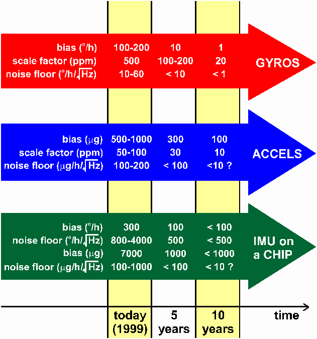 Figure (4) relates the predicted development of MEMS-based inertial sensors to three major performance parameters - bias, scale factor and noise. These parameters are usually considered when judging system accuracy. They show that, for the medium term, two conclusions are possible at this time. First, MEMS-based inertial sensors will in general reach higher performance levels than the MEMS-based IMU-on-a-chip. This simply indicates that performance is dependent on the physical dimensions of the sensor or system. Second, it appears possible that MEMS-based tactical IMUs will become a reality within a ten year time frame, but that navigation-grade systems are rather unlikely during that period. For more details see Schwarz and El-Sheimy (1999), Barbour (1996), and Allen et. al. (1998).