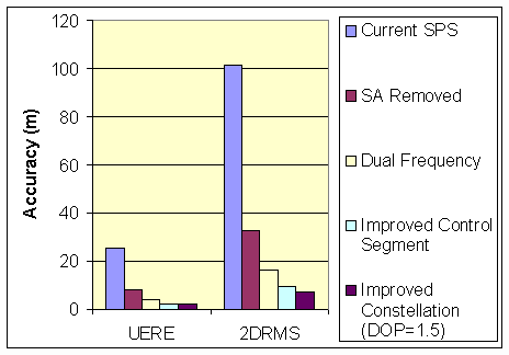 The Future Enhancement of GPS: The proposed enhancements to GPS have the common goal of increasing both the capability and robustness of the system. The possible major modifications to the system include the removal of the intentional degradation of the signals (SA), the introduction of new signals, improvements in the control segment functions and increases in the size of the GPS constellation. The potential effects of these have been lumped together and are shown in Figure (4). It is estimated that they will improve the 2DRMS to about 9.5m. These are long term goals and no firm commitments have yet been made.