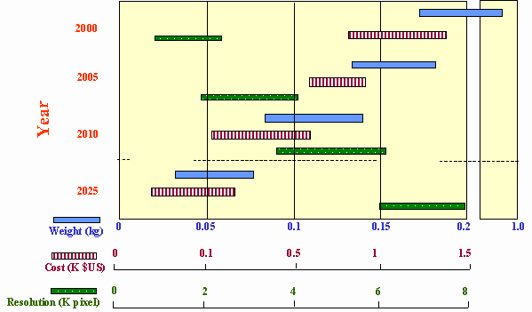 Future Trends of Vision-Based Systems and Map Matching Techniques: Conceptually, the vision-based concept is very attractive. Current experimental systems are limited in range and are oriented towards robotics applications. Figure (6) shows the future trend in digital cameras prices, resolution, and weight. The price and weight are going down while the resolution is going up. VBS hardware (digital cameras, storage devices, portable computers) could currently support the development of an autonomous VBS at the level of 10K US$ and a weight less than 2 kg. This indicates that low-cost and lightweight systems based on digital cameras are feasible. The major challenges are algorithms and software that make their use in unstructured environments possible. Smart image matching and 3D modeling of the VBS environment are not at a stage to support such a development. What complicates the problem is that the currently market demand for a stand-alone VBS is limited.