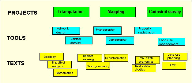 Regarding the modules which will be necessary for problem oriented education we may divide them according to pedagogic levels. We call these levels "TEXTS", "TOOLS" and "PROJECTS". The attached example is imaginary, but tends to describe how a curriculum would be composed through the three.
