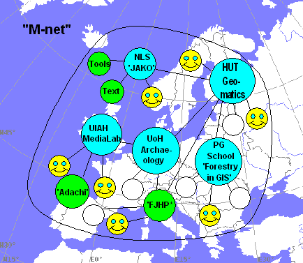 Externally the accumulation function becomes supportive by outsourcing. The outsourcing is the way by which both scientific and professional communities may cooperate in producing common material for "TEXTS" and "TOOLS" levels, or in organizing interdisciplinary campaigns on "PROJECT" and  "RESEARCH" levels. Within M-net we have currently such actions with several institutions already. The abbreviations are: HUT for Helsinki University of Technology, PG for post graduate, UoH for University of Helsinki, UIAH for University of Art and Design Helsinki, and NLS for National Land Survey of Finland. The 'JAKO', 'Adachi' and 'FJHP' are examples of project names.