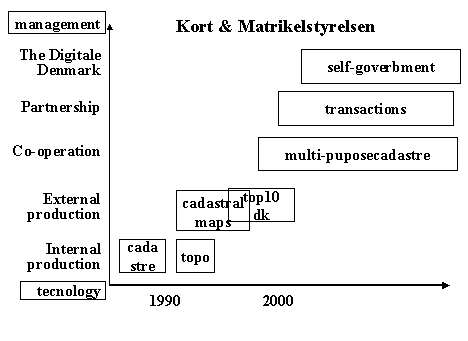 The starting point for a common spatial data infrastructure is the smallest intersection of data and a set of "Highway Codes" for the vertical "Information Highway". The highway codes will comprise standards, data models, exchange formats, meta-databases, agreements on common object definitions etc. The actors will be organizations, agencies, public and private business and citizens who have a need for creating information crossing the established boundaries and structures. If you would like to read more about National Spatial Infrastructure I can warmly refer to the research of Professor Ian Masser from the ITC in Holland. 5. DEVELOPMENT OF AND CHANGE IN COMPETENCEThe individual organization should be prepared for requirements or needs on new competence, just as it will be appropriate/necessary to review and re-estimate the organization as such from time to time. This process requires involvement from the top-management. To illustrate the dependencies between the different stages of development and competence I’ll show you what has happened to the National Survey and Cadastre Denmark (KMS) over the last ten years. The period where we converted our maps to digital form and entered the marked for digital data and information.