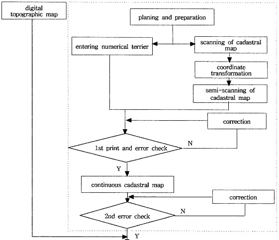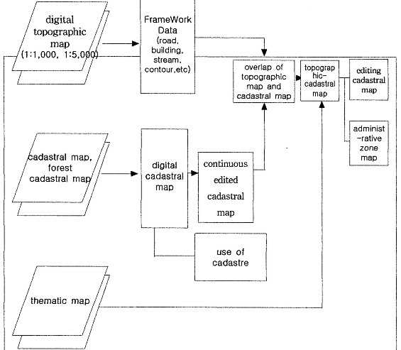 THE PILOT PRODUCTION OF TOPOGRAPHIC-CADASTRAL MAPS AND ITS APPLICATIONS IN KOREAProf. Yun-Soo CHOI and Prof. Byung-Uk PARK, KoreaKey words: NGIS, Thematic map, Topographic-cadastral map, Administrative boundary map, Data model. AbstractThe Government confirmed the action planning of digital mapping project for major thematic maps based on 'Revised Plan for The Development of the National Geographic Information System' (NGIS). Mapping for major thematic maps was begun in 1998 when digital mapping project for topographic maps finished due to the delay of the action planning, and will selectively have produced the essential digital thematic maps according to the frequency of usage by the year of 2000. The models of topographic-cadastral maps and administrative boundary maps around Suwon were produced in accordance with the presented draft. We presented specification for production of the most appropriate topographic-cadastral maps and administrative boundary maps through the analysis of the process of production, discussion and error check, and correction of the produced topographic-cadastral maps and administrative boundary maps. And we could make it easier to develop digital mapping project of topographic-cadastral maps and administrative boundary maps effectively by presenting the strategy for data input and maintenance, the cost model for carrying out the digital thematic map production, digital topographic maps, and the supplement of data model and data format. Topographic-cadastral maps has a wide range of usage but a lot of difficulties in the process of production and map update under use. So it seems that the study on users, university, private sector and municipal self-government must follow for promoting the use of topographic-cadastral maps. 1. PREFACEIn addition to national base map, converting major thematic maps into digital map can have the widespread effect on extending GIS market and on the use of GIS because it can cause vast potential demands and is applicable in various fields. It often happens that the location of relevant parcel should be identified on the present topography when a public agency plans and manages administrative affairs. Because topographic map and cadastral map are correlated with each other, they are often used together. However, cadastral map is the data related to the ownership, so it has a limited use. Some troubles can be caused because there is a miss matching part when topographic map and cadastral map are overlapped. Consequently in this study topographic-cadastral map was pilot-produced and the most suitable specification for topographic-cadastral map production was presented through overlapping them, taking Suwon as example. It can be used in administrative department and private sector which aren't related to land ownership. 2. ANALYSIS OF THE PRESENT CONDITION OF TOPOGRAPHIC-CADASTRAL MAP AND USERS' DEMANDS FOR IT2.1 The present condition of topographic-cadastral map2.1.1 Topographic map Topographic map usually approved as National Base Map is the map which is produced and distributed by National Geography Institute (NGI). And it is one of the accomplishments made by basic survey (Article 1 of the Surveying and Mapping Law). There are maps drawn on a scale of 1/5000, 1 /10,000, 1/25,000, 1/50,000, 1/100,000, and 1/250,000. A map is designated as base map when it is standardized, accuracy is uniformed and it is drawn on the largest scale. Digital mapping project of topographic map is superintended and implemented on the basis of the master plan for the development of the National Geographic Information system by National Geography Institute, geographic information subcommittee. There are 5 subcommittees in NGIS: coordinating and planning subcommittee, geographic information subcommittee, land information subcommittee, standardization subcommittee and technology development subcommittee. Digital map is produced on the basis of Specification for Digital Mapping at Scales between 1/1000 and 1/25,000 and classified into 9 Layers such as rail way, stream, road, building, tributary, institution, topography, administration, regional boundary and cycle. Feature code which belonged to Layer is given 750 definitions and consisted of the 4 level NGI feature classifications -first, second, third, fourth level. 2.1.2 Land cadastral map Cadastral map is cadastral map and forest cadastral map. It is