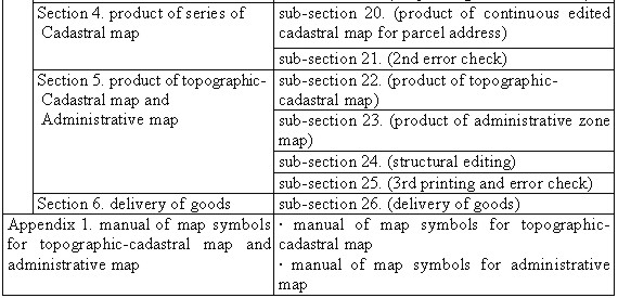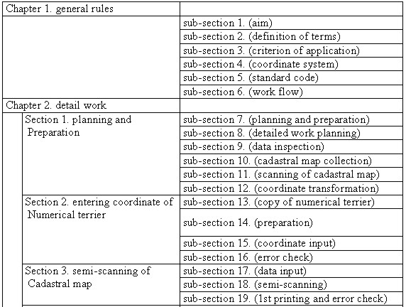 4.2 The measures for improvementWhen maps were pilot produced taking Suwon as example in this study, there was no guidelines for topographic-cadastral map production. The measures presented in the process of pilot production are as follows. 1) The problem of datum origin Then Korean government established local datum in Kyeonggi province and Daegu, and surveyed them before Korea land survey project. These were called old geodetic datum areas. Suwon, a model area for pilot development, was the place where Korea geodetic datum and old geodetic datum were adjacent. This was the place which had a difficulty in edge matching because sheet lines were overlapped when putting together cadastral maps. After understanding precisely old geodetic datum included in the cadastral map, digital data of land cadastral map of old geodetic datum area was coordinate transformed into the coordinates of Korea geodetic datum. For this, displacement of geodetic datum, azimuth and rotation angle were calculated, and used as parameter for coordinate transformation of break point of boundary. 2) The problem caused when merging maps It was solved to accord the boundaries of the area adjacent to edges of land cadastral maps by way of GIS and S/W. The discrepancy between sheets of cadastral maps was found in the boundaries of adjacent edges as well as in the case of being adjacent because law district was changed according to a equally reduced scale. It was also found when sheets of differently reduced scale were adjacent and when sheets of disagreement area between cadastral map and present surveying result in a equally reduced scale were adjacent. When adjacent edge lines between each sheet were in discord, the shortest boundary point of parcel in both ends of edge area was connected by a straight line and the other lines were eliminated. When the lines were overlapped, cadastral limit was closed in one map and the cadastral limit of the other was not closed. In this case, the closed cadastral limit was restored and the unclosed cadastral limit was eliminated. When the cadastral limit of small scale map was isolated in an adjacent area of different scaled maps, it was eliminated on the basis of the cadastral limit of big scaled map. In the case parcel which was not related to surroundings was overlapped, the cadastral limit was eliminated according to parcel number. It was the best way to decide which line to choose through topographic field survey to accord different types of disagreement. 3) The problem caused when inspecting The steps of inspection on the accomplishment of pilot development were considered important when this study was under way. The ways to evaluate the quality and the accuracy of thematic map were various according to the types of data and the way of inspection. The evaluation of the quality of data was for deciding whether thematic map was suitable to target usage, and it was divided into two ways: one was to evaluate absolute accuracy to compare input thematic map with feature of real world and the other was to evaluate relative accuracy between graphic information of produced thematic map and attribute information. Whole number inspection, sample inspection, overlapping inspection, computer inspection and automatic inspection appeared to be appropriate ways to inspect thematic map. The process of real inspection was in the order of inspection with naked eyes, inspection of screen, inspection by digital map program and inspection of completion. At first all was inspected on the basis of 80% sampling but 85% sampling was used for inspection with naked eyes and screen inspection to improve the accuracy. Eventually in the cases of inspection by digital map program and completion inspection, the accuracy of accomplishments was improved through whole number inspection. 4) The measures for improvement of digital topographic map As the project of development of NGIS started, computerization of topographic map which was national base map was conducted during the short period. Because of this reason following correction and supplement were needed. In the case of disagreement between topographic map and present topography, it cost a lot of money and took time for surveying extra correction or research again on it. The measure should be taken to make use of the accomplishment of development of GIS conducted in municipal self-government or public institution rather than conduct extra project. Next step was data modelling and format. Format of digital topographic map and layer system should be added and supplemented in accordance with use of GIS in various fields. Korean Framework Data should be developed for making the most of digital topographic map, for improving accuracy and preventing double investment on the development of data during the process of thematic map production. It was also necessary to simplify and standardize the way of transcribing on the present digital topographic map. For example when road center line was drawn, an imaginary center line was drawn on the crossing when one-way street and both-way street crossed each other. In the case one-way street and both-way street crossed, an imaginary road center line was drawn on the one-way street and on the node in the center of crossing. When each feature was drawn like this, it was necessary to review classification system and classification method for classification of feature, considering the importance of each feature. 5. GUIDELINES FOR TOPOGRAPHIC-CADASTRAL MAP PRODUCTIONIn this study guidelines for topographic-cadastral map production was presented through pilot production. It consisted of chapter 1 (General rules) and chapter 2 (detailed work according to process and annexed standardization of map symbols). Chapter 1 included general contents such as aim, definition of the term, coordinate, standard feature code and work flow. In chapter 2, the course of work was detailed. Table 3 is the content of guidelines for topographic-cadastr